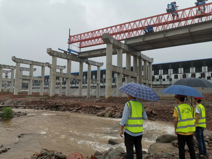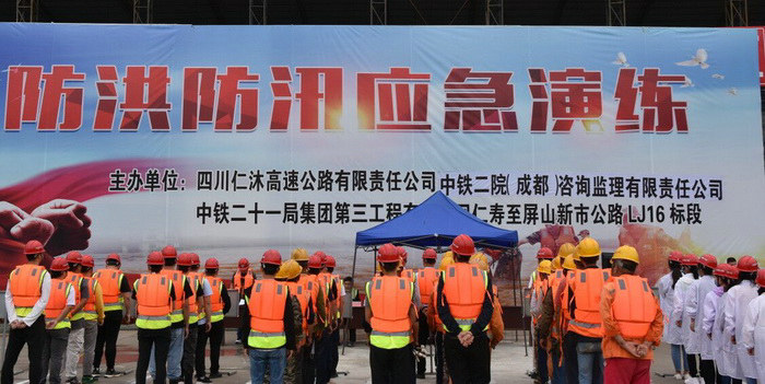 圖為防洪應(yīng)急演練現(xiàn)場 開展汛期安全隱患進(jìn)行排查。項(xiàng)目部防汛應(yīng)對(duì)工作領(lǐng)導(dǎo)小組組織人員到現(xiàn)場進(jìn)行安全隱患排查,對(duì)中都隧道進(jìn)出口、中都互通樞紐及停車區(qū)、徐家壩大橋、月兒壩大橋、莊子上大橋、桅桿嘴大橋及宏安壩大橋、預(yù)制梁場等大型工點(diǎn)及各路基段、涵洞工點(diǎn)、勞務(wù)作業(yè)人員駐地進(jìn)行了防汛隱患排查,針對(duì)現(xiàn)場塔吊、腳手架、深基坑、起重機(jī)械、高大模板、臨時(shí)設(shè)施和駐地房屋、拌和站料罐用攬風(fēng)繩、駐地臨時(shí)用電、排水系統(tǒng)等進(jìn)行了全面排查,對(duì)30余處安全隱患問題進(jìn)行了現(xiàn)場整改落實(shí),并嚴(yán)禁工人在降雨期間野外作業(yè)。