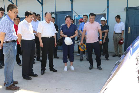 圖一、天津港保稅區(qū)管委會(huì)尤天成書(shū)記(前排中)與建筑公司執(zhí)行董事、黨委書(shū)記(前排右二)在現(xiàn)場(chǎng)交流