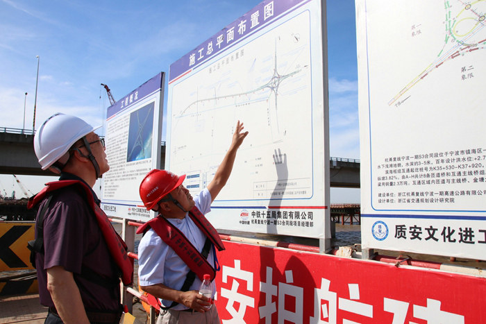 下午3點(diǎn),陳戈到杭甬項(xiàng)目濱海互通仔細(xì)查看了棧橋架設(shè)、鋼護(hù)筒打插、鉆孔機(jī)鉆孔,承臺(tái)、墩身模具安裝、塔吊作業(yè),以及連續(xù)梁施工工藝流程,查看了“大臨”鋼筋加工棚技術(shù)工人加工鋼筋籠情況。他在檢查過程中,聽取了二公司副總工程師兼杭甬項(xiàng)目負(fù)責(zé)人黃偉關(guān)于項(xiàng)目安全質(zhì)量、進(jìn)度環(huán)保和下一步施工推進(jìn)方案等情況介紹。