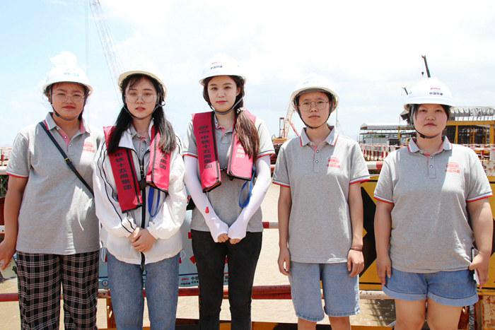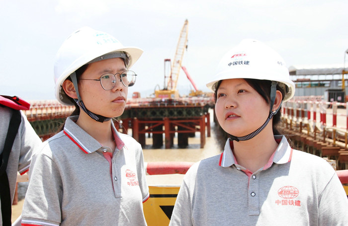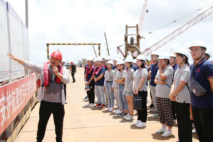 隨后,組織大學(xué)生到濱?;ネê蜑I海高架觀摩。當(dāng)大巴車載著學(xué)生們進入施工現(xiàn)場的時候,他們被海上兩座大橋雄偉壯觀的場景深深地吸引,紛紛舉起手機拍照。該項目副經(jīng)理喬繼保向大學(xué)生介紹了項目的安全質(zhì)量、進度產(chǎn)值,以及工程進展情況。