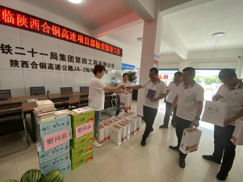 盛夏七月,驕陽似火。7月21日,中鐵二十一局四公司副總經(jīng)理、總會(huì)計(jì)師許海英,總部工會(huì)工作部人員走進(jìn)陜西合銅高速JA-2標(biāo)項(xiàng)目部為一線職工送去了戶外鞋、飲料、西瓜等防暑用品和書籍。