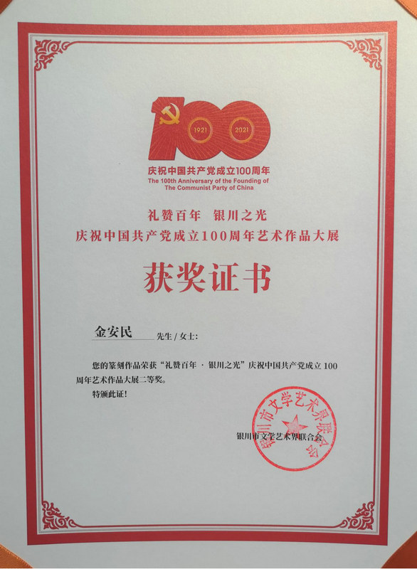 7月21日,中鐵二十一局四公司職工金安民的篆刻作品榮獲銀川市文學藝術界聯(lián)合會舉辦的“禮贊百年·銀川之光”慶祝中國共產黨成立100周年藝術作品大展二等獎。