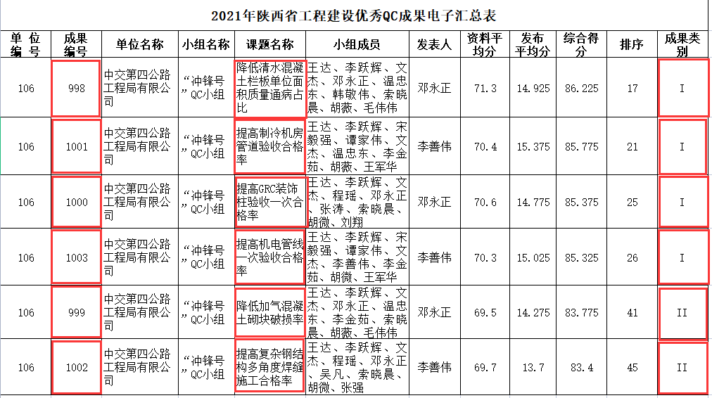 近日,陜西省建筑業(yè)協(xié)會發(fā)布《關于表彰2021年陜西省工程建設質(zhì)量管理小組活動優(yōu)秀小組的通知》文件,中交四公局第二建筑分公司漢中區(qū)域總項目《提高GRC裝飾柱驗收一次合格率》、《降低清水混凝土欄板單位面積質(zhì)量通病占比》等六項QC成果獲2021年陜西省工程建設質(zhì)量管理小組活動一類成果4項,二類成果2項。