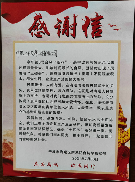 表?yè)P(yáng)信高度評(píng)價(jià)了該項(xiàng)目部在古林鎮(zhèn)遭遇水災(zāi)之時(shí),伸出援手,展現(xiàn)了央企的社會(huì)擔(dān)當(dāng)和大格局情懷,路地一家親。