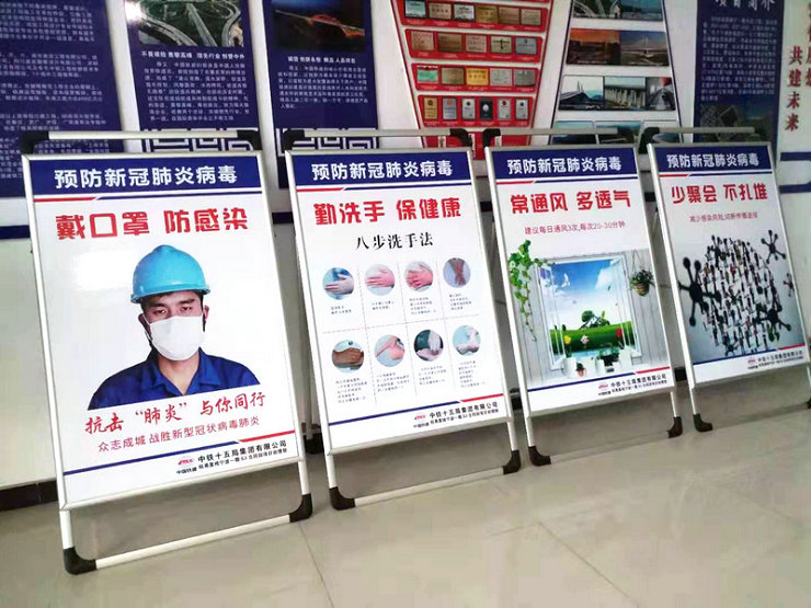 其次,在項目部、施工現(xiàn)場張貼、懸掛新冠肺炎防控宣傳畫和標(biāo)語,并利用會議等形式對員工進(jìn)行疫情防范教育,使大家養(yǎng)成勤洗手、愛干凈習(xí)慣,從思想上、行動上引起足夠重視,同心協(xié)力打一場新冠疫情防疫仗,確保一方平安。