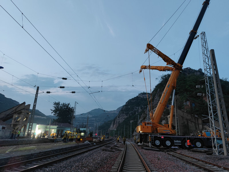 后寨車站上跨橋梁是是上世紀七十年代修建的人行天橋,跨越車站共五條股道?,F(xiàn)因橋體病害嚴重已廢棄,但高懸在太焦鐵路線上,對行車安全造成重大威脅。中原公司接到拆橋任務(wù)后,公司各級精心組織焦作項目部和設(shè)計、各配合單位精誠合作,攻堅克難。面對疫情防控、汛期施工、地理環(huán)境復(fù)雜等不利因素,在危橋拆除與山體危石爆破交叉施工的不利情況下,項目部強化組織,各部門通力合作,晝夜不懈奮戰(zhàn),從勘察現(xiàn)場、編制報批方案、拆除接觸網(wǎng)、拆除破碎危橋、接觸網(wǎng)恢復(fù)到線路開通僅用9天時間,做到了施工文明、質(zhì)量達標、安全可控,體現(xiàn)了中原鐵軍的擔當。