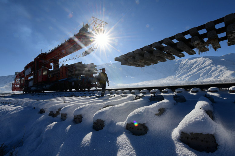 川藏鐵路拉林段在雪中鋪軌