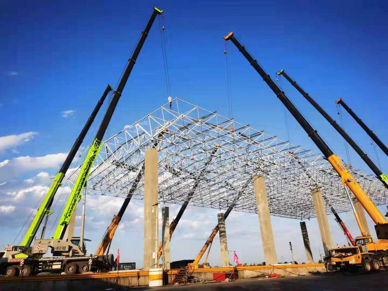 此次網(wǎng)架吊裝作業(yè)是風(fēng)雨棚施工中的重要環(huán)節(jié),涉及鐵路既有線,工期緊、任務(wù)重、吊裝高度高、施工難度大,對專用線安全運輸影響大,安全風(fēng)險高。為確保此次吊裝施工作業(yè)安全順利地完成,施工人員經(jīng)過反復(fù)現(xiàn)場勘測,研究論證,吊裝重量驗算分析,與中疆公司、昌吉車站積極溝通協(xié)調(diào),結(jié)合當(dāng)天的行車組織不斷優(yōu)化改進施工方案,最終確定采用3臺100噸、5臺80噸及2臺50噸起重機共計10臺汽車式起重機相互結(jié)合,同步起吊的施工方案。
