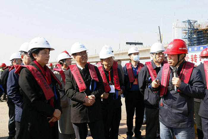 上午10點(diǎn),余紅藝一行50多人乘3輛中巴到達(dá)位于濱海互通立交南側(cè)的施工現(xiàn)場,在一塊10米長的巨幅宣傳牌前,聽取寧波市交通局副局長樊獻(xiàn)鵬關(guān)于杭甬項(xiàng)目情況匯報(bào)。樊獻(xiàn)鵬手握話筒一會兒指著制作的兩張高速公路網(wǎng)圖和濱?;ネㄈ皥D,一會兒面向各位領(lǐng)導(dǎo),就杭甬復(fù)線寧波一期高速公路建設(shè),對改善杭州灣區(qū)域路網(wǎng)結(jié)構(gòu)、推進(jìn)環(huán)杭州灣區(qū)建設(shè)、打造寧波舟山港集疏運(yùn)網(wǎng)絡(luò)北向主要貨運(yùn)通道、加強(qiáng)寧波舟山港集疏運(yùn)能力、促進(jìn)長三角一體化和沿海經(jīng)濟(jì)社會高質(zhì)量發(fā)展具有重要意義等作了詳細(xì)介紹。然后,他將杭甬項(xiàng)目濱?;ネㄖ攸c(diǎn)作了介紹。他說,中鐵十五局承建的濱?;ネㄕ己C娣e613畝,保守地說是亞洲最大的海上互通立交,據(jù)查證,目前世界上還沒有比濱海互通更大的海上立交,施工難度大,技術(shù)含量高,安全風(fēng)險(xiǎn)大。這個(gè)項(xiàng)目前期因?yàn)槎喾N原因,進(jìn)度有點(diǎn)滯后,現(xiàn)在趕上來了,按期完成建設(shè)任務(wù)沒問題。隨后,余紅藝一行在F匝道查看了樁基施工情況。她指出,濱海互通是浙江省和寧波市的重點(diǎn)建設(shè)項(xiàng)目,百年大計(jì),質(zhì)量必須要保證。安全也要注意,冬天來了,氣溫大幅下降,高空和夜間作業(yè),大風(fēng)天氣要做好安全防護(hù)工作,確保施工人員安全。