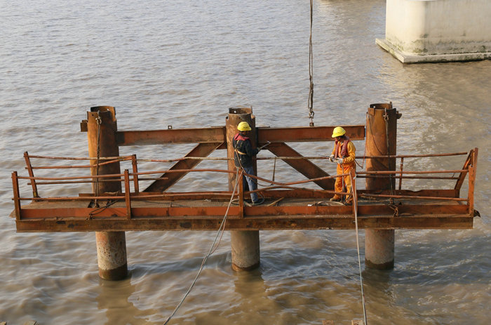 為此,從今年9月份起,該項(xiàng)目部組織棧橋隊(duì)進(jìn)行破拆濱海高架28—53墩位置的1200米鋼棧橋,因部分墩身尚未移交,目前只拆除550米,現(xiàn)已拆除46跨棧橋。在拆除過(guò)程中,該項(xiàng)目部嚴(yán)格按照高空、水上作業(yè)安全操作規(guī)程做好安全工作,由專(zhuān)職安全員全程跟蹤,規(guī)范作業(yè)人員的行為,對(duì)履帶吊司機(jī)和參與破拆的電焊工,堅(jiān)持做到崗前警示、施工中檢查指導(dǎo),發(fā)現(xiàn)嫌麻煩不拴保險(xiǎn)繩者,立即糾正,事后提出嚴(yán)厲批評(píng),堅(jiān)決杜絕類(lèi)似不安全苗頭的發(fā)生。