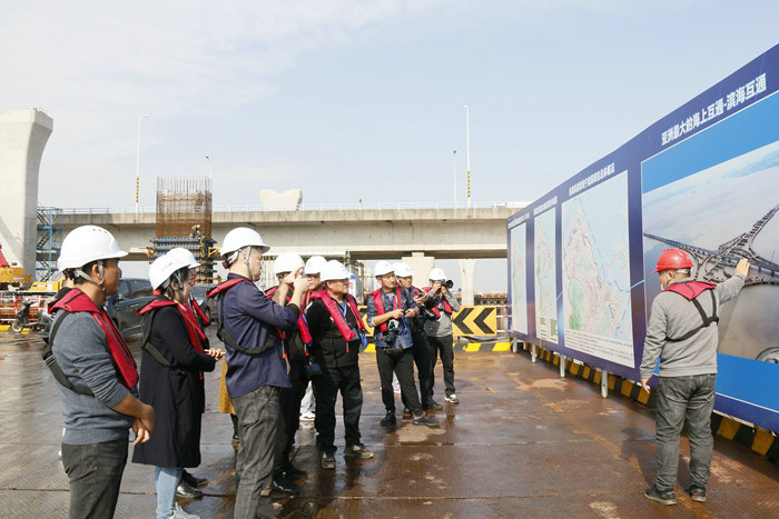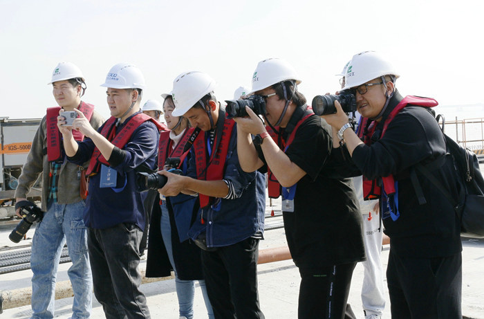 杭甬復線寧波一期高速公路有限公司、寧波市攝影家協(xié)會組織《新華社》《中新社》《浙江日報》《學習強國》《浙江日報》《浙江旅游交通導報》《寧波日報》《寧波晚報》等10家中央媒體、省級媒體記者以及多次獲得過國家級攝影金獎、銀獎的浙江省、寧波市著名攝影家到杭甬復線集體采風,對全線5個標段集中進行現(xiàn)場采訪、拍攝有亮點的圖片,規(guī)模和聲勢較大,以圖片攝影為主,用圖片展示項目風采和魅力。上去9點40分,多家媒體記者和攝影家?guī)е?ldquo;長槍短炮”、無人機來到位于3號支棧橋位置,依海堤,或憑欄,聚焦氣勢宏偉的濱海高架橋和跨越直徑4.5米輸油管道的懸臂連續(xù)梁,快門“咔嚓咔嚓”響個不停,淡黃色的海水與大橋融為一體的畫面在一瞬間定格。一臺臺無人機在“嗚嗚”聲中起飛,在幾百米高空變換著不同角度,將正在建設的大橋畫面拍攝下來。記者、攝影家難遇這么壯觀的場景,興致勃勃,面露笑容,豐富的素材資源為攝影者提供了絕佳的拍攝機會,人人收獲多張不同角度、不同畫面的美圖。