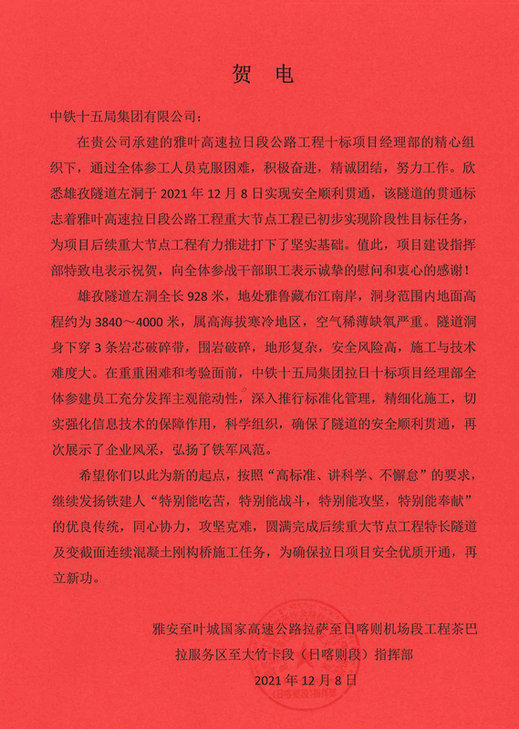 12月8日上午10時,從中鐵十五局集團雅葉高速拉日十標項目傳來喜訊息,該項目雄孜隧道左洞順利貫通。據(jù)悉,該座隧道是雅葉高速拉日段公路工程(中間段)6個標段中首座貫通的隧道,業(yè)主指揮部特發(fā)來賀電表示祝賀。