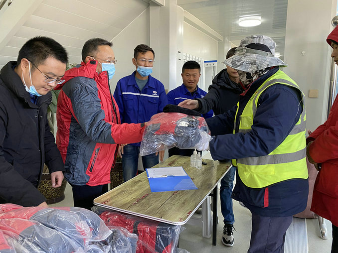 “看著這氣溫下周就零下了,工人們?cè)诂F(xiàn)場(chǎng)施工是越來(lái)越冷了呀。”塔城項(xiàng)目負(fù)責(zé)人柴桂林一邊翻著手機(jī)一邊陷入沉思。“馬上聯(lián)系塔城當(dāng)?shù)貏诒J袌?chǎng),盡一切可能在本周末前給所有施工人員統(tǒng)一購(gòu)置高質(zhì)量的棉衣、棉帽等保暖用品,通知各施工隊(duì)伍前來(lái)領(lǐng)取。”隨即,他打電話給綜合辦安排了這項(xiàng)工作。