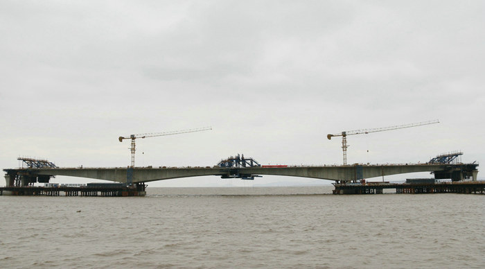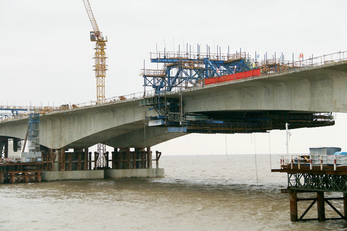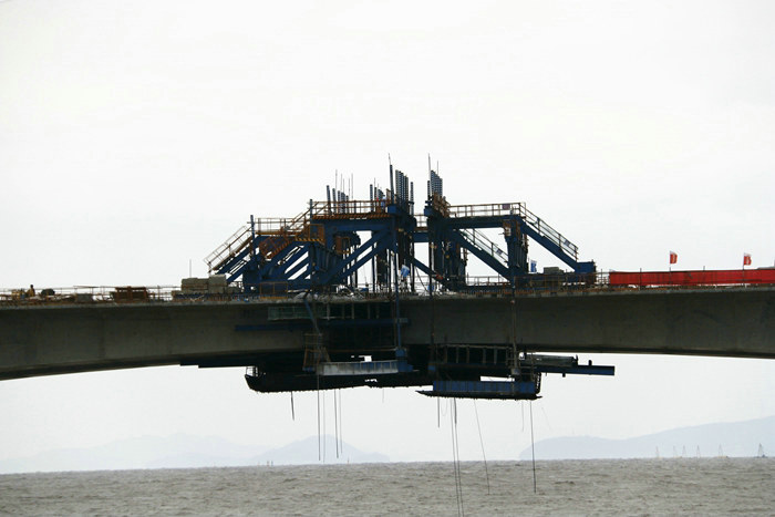 為了確保安全、優(yōu)質高效地完成連續(xù)梁建設任務,該項目部從多家有海上橋梁施工經驗的投標單位中篩選出兩家單位負責連續(xù)梁88墩和89號墩共34節(jié)段(塊)掛籃施工。對進場材料,堅持做6次檢驗,每一組數(shù)據(jù)都必須達標,不符合標準的鋼材不準進入。混凝土由兩座大型拌合站集中加工和供應,從源頭杜絕了不合格品。其次,除現(xiàn)場監(jiān)理、業(yè)主挑毛病外,該項目部加強全過程工序監(jiān)督指導,推行安全質量獎罰制度,每月對監(jiān)管連續(xù)梁施工的副經理、技術人員、專職安全員進行考核,優(yōu)者重獎,劣者重罰,將橋梁施工與個人利害得失緊緊捆綁在一起,形成壓力和動力并存,責任與擔當同在的激勵機制。