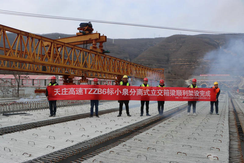 中鐵二十一局四公司天莊高速公路項(xiàng)目部承建的小泉分離式立交全長97m,上部結(jié)構(gòu)采用3*30m裝配式預(yù)應(yīng)力混凝土箱梁,共計(jì)24榀;下部結(jié)構(gòu)采用鉆孔灌注樁基礎(chǔ),圓柱式橋墩,橋臺(tái)采用肋板臺(tái)。自架梁施工以來,項(xiàng)目部克服了下穿10KV和35KV兩處民用高壓線,上跨G566國道,運(yùn)、架梁安全風(fēng)險(xiǎn)系數(shù)高等一系列困難,特別是近期抗擊疫情期間,項(xiàng)目部采取有效措施積極做好疫情防控工作,科學(xué)有序組織現(xiàn)場施工生產(chǎn),實(shí)現(xiàn)了“兩手抓、兩不誤”,圓滿完成了小泉分離式立交箱梁架設(shè)施工任務(wù),為下一步橋面系施工提供了工作面,確保了節(jié)點(diǎn)工期。