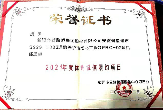 近日,北新路橋集團(tuán)長(zhǎng)三角分公司宿州市道路養(yǎng)護(hù)市場(chǎng)化工程項(xiàng)目獲得由宿州市公路管理服務(wù)中心項(xiàng)目辦授予的2021年度優(yōu)秀誠(chéng)信履約項(xiàng)目榮譽(yù)稱號(hào)。