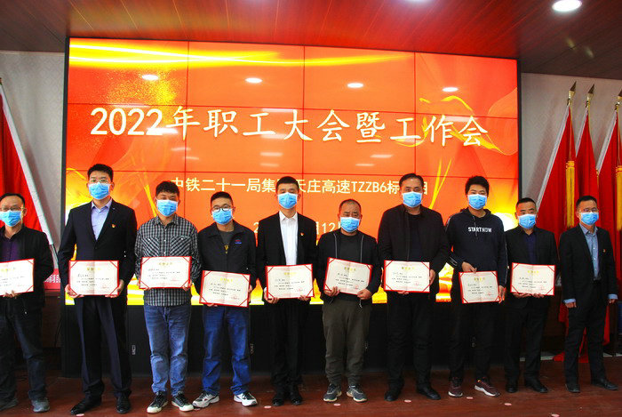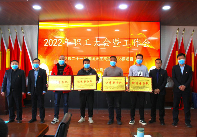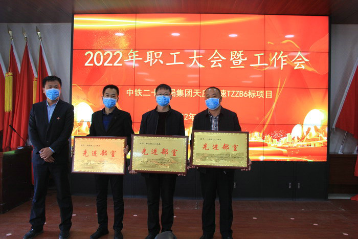 圖為“先進(jìn)部室”領(lǐng)獎天莊項目2022年職工大會暨工作會在慷慨激昂的《鐵道兵志在四方》歌曲聲中圓滿落幕。