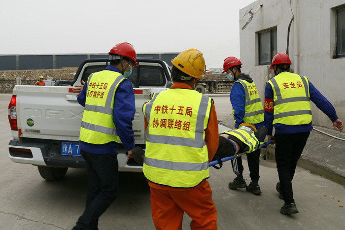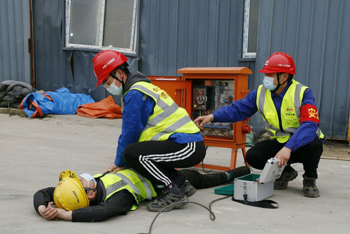 同時(shí),該項(xiàng)目部在演練的道具上做了精心謀劃,準(zhǔn)備了電焊機(jī)、電線、配電箱、木棍、救援車、擔(dān)架、對(duì)講機(jī)、口罩、反光背心、警戒帶和裝有創(chuàng)可貼、紫藥水、膠布、紗布、酒精、剪刀的應(yīng)急藥箱。