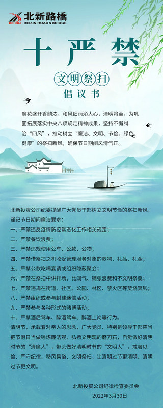 清明節(jié)將至,北新路橋北新投資公司紀委發(fā)出“十嚴禁”文明祭掃倡議書,旨在進一步落實中央八項規(guī)定及其實施細則精神,引導(dǎo)黨員干部切實做好清明節(jié)期間廉潔自律各項工作,堅決杜絕各種封建迷信、奢侈浪費行為,崇尚廉潔、文明、節(jié)儉、綠色、健康的祭掃新風(fēng),積極培育和營造良好社會風(fēng)氣。