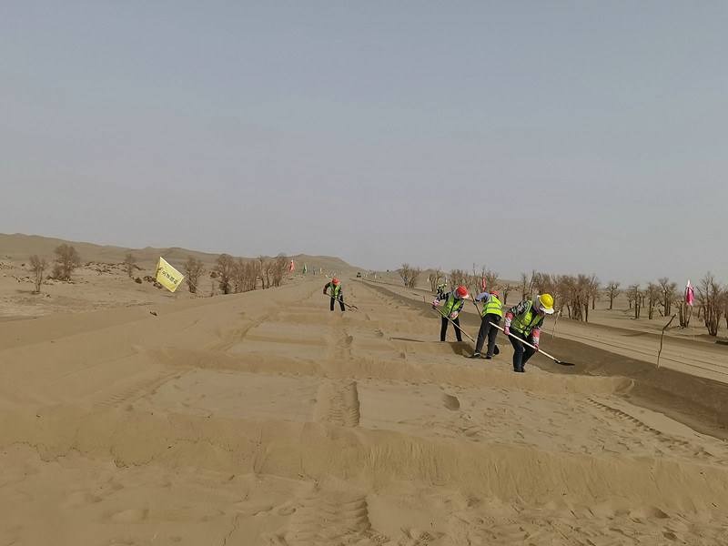 盡管施工現(xiàn)場風(fēng)沙呼嘯,但是依然不能阻擋建工人內(nèi)心的激情澎湃,在路基填筑現(xiàn)場一片“大干”的景象,“打井灌水要滲透2-3米深”,“機械設(shè)備準(zhǔn)備完畢”,“原地面處理完成”,各項工作有序推進,路基試驗段的順利開工鼓舞了身處惡劣環(huán)境中施工人員的士氣,同時為風(fēng)積沙路基填筑的全面施工打下了堅實的基礎(chǔ)。