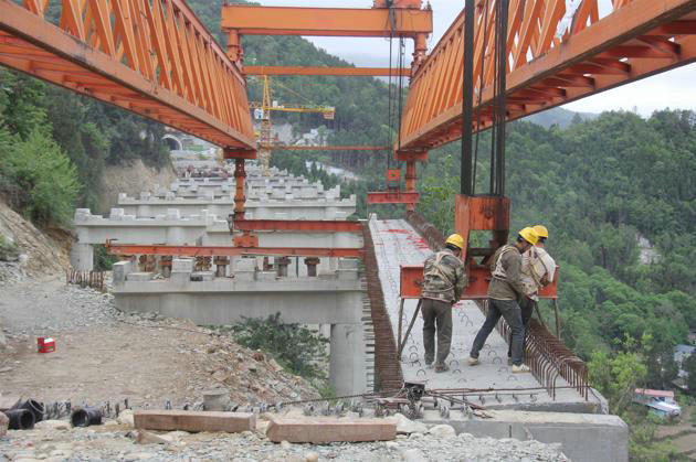 據(jù)悉,柴嶺里大橋位于四川省綿陽(yáng)市平武縣龍安鎮(zhèn)雙安村,區(qū)內(nèi)地形地貌以構(gòu)造剝蝕中低山、低中山為主,嶺脊曲折,溝壑崎嶇。該橋梁為左右線分離式橋,左線橋長(zhǎng)230+160m,橋?qū)?2m,右線橋長(zhǎng)451m,橋?qū)?2m,最高橋墩50m。右線上部結(jié)構(gòu)采用7*30+6*40m預(yù)應(yīng)力砼簡(jiǎn)支T梁,左線采用5*30+6*40m預(yù)應(yīng)力砼簡(jiǎn)支T梁,下部結(jié)構(gòu)橋墩均采用柱式墩;橋臺(tái)均采用樁柱式橋臺(tái),樁基均按端承樁設(shè)計(jì)。全橋共有預(yù)制預(yù)應(yīng)力砼簡(jiǎn)支T梁120榀。加之疫情反復(fù)、降水等不利因素,給施工難度層層“加碼”。