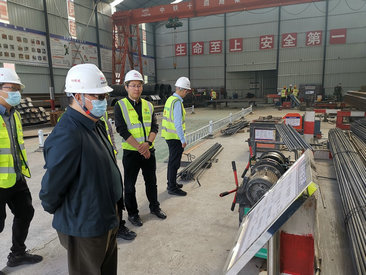 指揮長(zhǎng)李兵(左1)在中梁山隧道進(jìn)口鋼筋加工場(chǎng)現(xiàn)場(chǎng)檢查