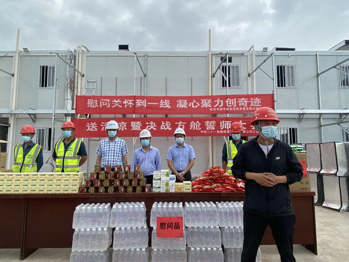 圖為城投公司領(lǐng)導(dǎo)為一線建設(shè)者發(fā)放慰問品