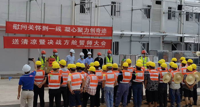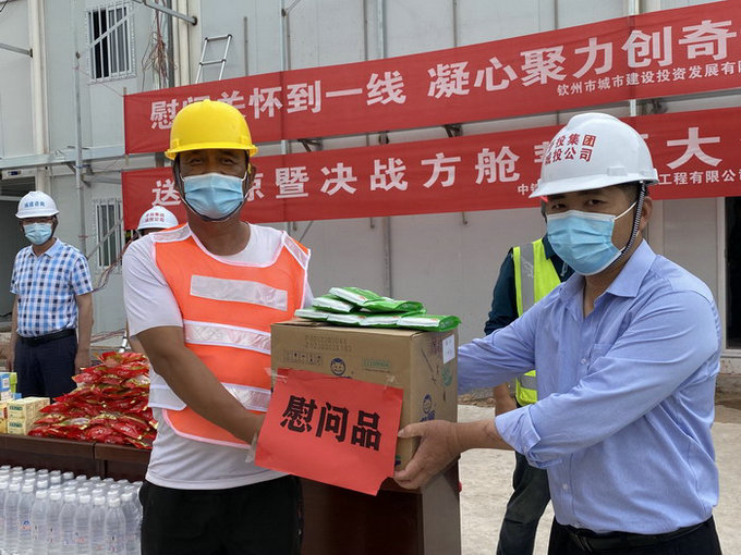 圖為城投公司領(lǐng)導(dǎo)為一線建設(shè)者發(fā)放慰問品 欽州市城市建設(shè)投資發(fā)展有限公司領(lǐng)導(dǎo)將防暑藥品、花茶、冰糖、礦泉水、濕巾紙等慰問品一件件發(fā)到工友手中,親切的對(duì)工友說:“感謝你們奮戰(zhàn)在施工一線,不畏高溫、堅(jiān)守崗位,出色地完成各項(xiàng)生產(chǎn)任務(wù)”。中鐵二十一局三公司工管部部部長(zhǎng)宋小軍特意叮囑大家要合理安排工作,注重崗位安全,提高夏日防暑意識(shí),保證自身健康。