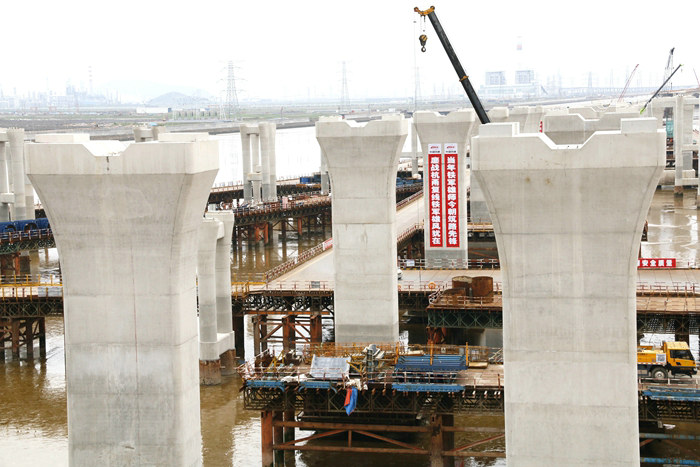 該公司承建的杭甬復(fù)線寧波一期S3合同段濱?;ネ?,位于寧波市鎮(zhèn)海區(qū)海域內(nèi),主線6.9公里,施工區(qū)域水深約3-5米。濱?;ネ屑~采用變形苜蓿葉形互通型式,主線橋梁長(zhǎng)2390米,匝道橋8座,長(zhǎng)6386.626米,是亞洲規(guī)模最大的海上互通立交。
