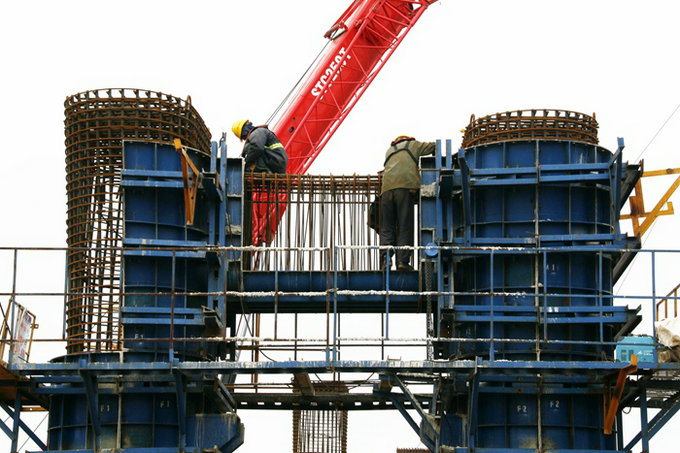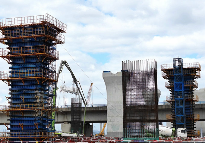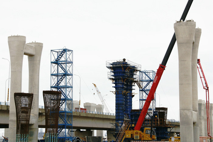 因此,像往常一樣,杭甬項(xiàng)目濱海互通立交工地,在技術(shù)人員的指導(dǎo)下,只見履帶吊操縱振動力重達(dá)200噸的防音型振動錘,緊緊咬住鋼護(hù)筒,不住地發(fā)出“嗡嗡”的聲響,有節(jié)奏地一寸一寸地插向海底。在主線橋和A匝道橋,混凝土罐車的罐子不停地旋轉(zhuǎn),由地泵將一方方混凝土源源不斷地輸送到20多米高的橋墩模具內(nèi),一個(gè)小時(shí)內(nèi)將20多立方混凝土澆注完畢,等候在棧橋上的另一臺混凝土罐車?yán)^續(xù)同樣的步驟,8小時(shí)后,一座橋墩順利完工,這樣的場景每天都在重復(fù)著。在鋼棧橋上,運(yùn)送橋墩鋼筋籠、鋼護(hù)筒、承臺鋼模的大型貨車你來我往、穿織如梭。作業(yè)工人在橋墩上安裝鋼模的動作十分老練,三下兩下就將一個(gè)螺帽檸在螺桿上。在大臨鋼筋加工場,工人們啟動按鈕,將一根根粗壯的螺紋鋼自動輸送到車床上,機(jī)器快速地旋轉(zhuǎn),伴隨著低沉的嗡嗡聲,不消兩分鐘,鋼筋的一頭便出現(xiàn)約8厘米長的螺紋,一捆螺紋鋼筋一頭加工完畢,接著加工另一頭,有條不紊、精工細(xì)作,一次達(dá)到合格。在大棚的幾個(gè)鋼筋籠加工處,采用的是制動化作業(yè)流水線,技術(shù)工人將一個(gè)個(gè)成型的鋼筋圓圈與12米長的螺紋鋼筋焊接固定后,構(gòu)成一個(gè)雛形、簡約的鋼筋籠,然后將一盤小拇指粗的圓鋼筋一圈圈纏繞在鋼筋籠上,機(jī)器帶動著鋼筋籠旋轉(zhuǎn),電焊工麻利地在縱橫交叉點(diǎn)上焊接,焊花飛濺,將焊工全身映得通紅。以此推進(jìn),焊工重復(fù)著同樣的動作,直到將一個(gè)12米長的漂亮的鋼筋籠制作完成。制作一個(gè)鋼筋籠大約5個(gè)小時(shí)。