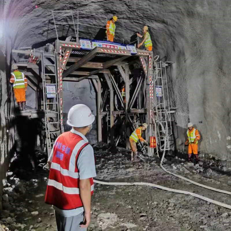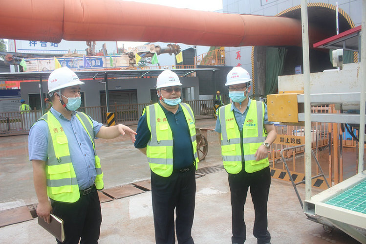指揮長(zhǎng)李兵(左2),副指揮長(zhǎng)陳華富(左1)在中梁山隧道進(jìn)口現(xiàn)場(chǎng)檢查