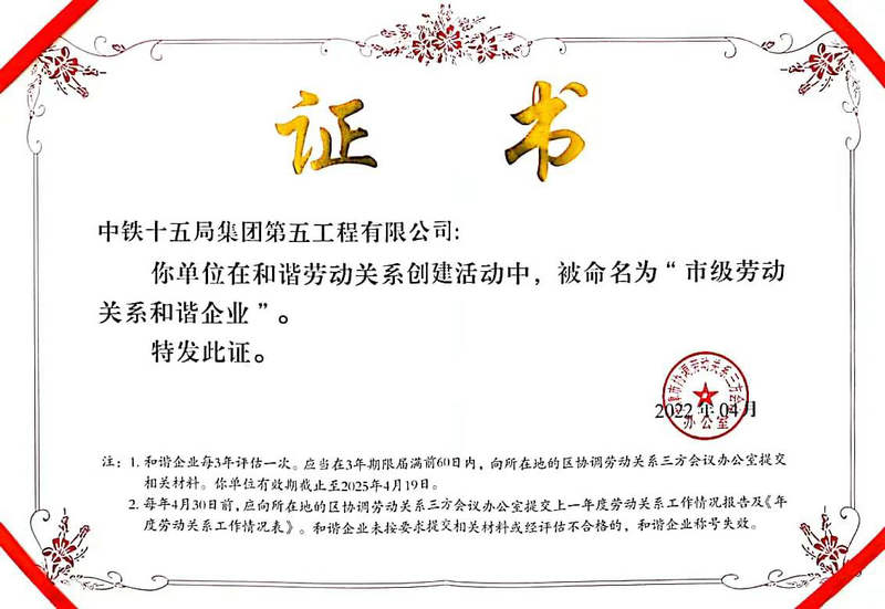 近日,天津市人社局會同市總工會、市國資委、市工商聯(lián)、市企聯(lián)聯(lián)合發(fā)文,命名43戶企業(yè)為市級勞動關(guān)系和諧企業(yè),中鐵十五局集團(tuán)第五工程有限公司榮列其中,可以享受免于勞動保障日常巡視檢查等16項(xiàng)政策支持。