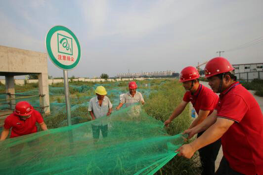 6、中鐵十八局集團(tuán)三公司寶坻管廊項(xiàng)目部項(xiàng)目經(jīng)理李賢松、副經(jīng)理溫興旺和技術(shù)人員在工地鋪設(shè)密目網(wǎng),防止產(chǎn)生揚(yáng)塵(伍振 攝)