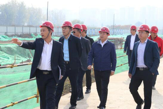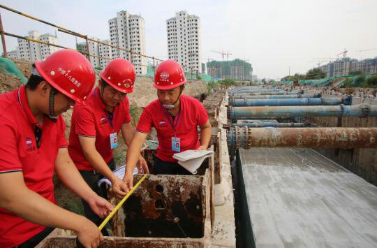 2、中鐵十八局集團(tuán)總經(jīng)理閆廣天、副總經(jīng)理陳建民、三公司津冀工程項(xiàng)目管理部經(jīng)理王海偉、寶坻管廊項(xiàng)目部項(xiàng)目經(jīng)理李賢松等在現(xiàn)場辦公( 周文婷 攝)