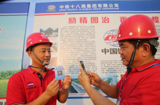 4、中鐵十八局集團(tuán)三公司寶坻管廊項(xiàng)目部打造信息化工地,圖為項(xiàng)目經(jīng)理李賢松在展示工作牌上的二維碼信息(伍振 攝)