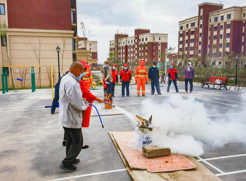 警報一響,參與演練的居民群眾和物業(yè)工作人員在物業(yè)經理的引導下,從樓棟有序撤出,迅速有序到達指定安全位置,用時不到5分鐘全部安全疏散。接著,項目經理對滅火器的使用,遇到火災時的應變與生存逃生,自救與互救的基本方法,小區(qū)常見防火安全隱患及常見火災類型等開展培訓,并進行了滅火演練。