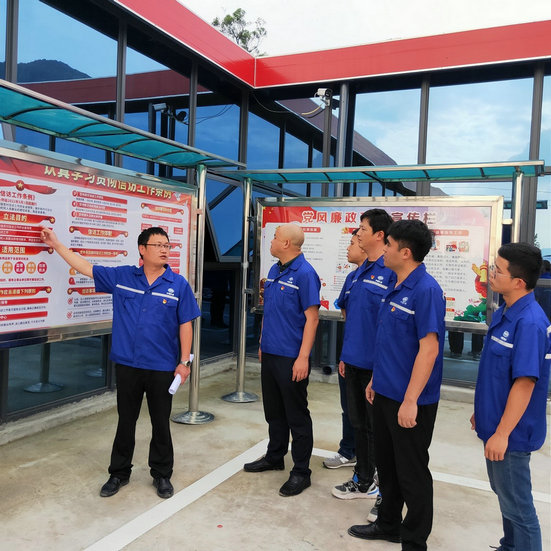 項目部書記何偉帶領黨員干部學習上墻上欄的黨風廉政建設重要教育內容