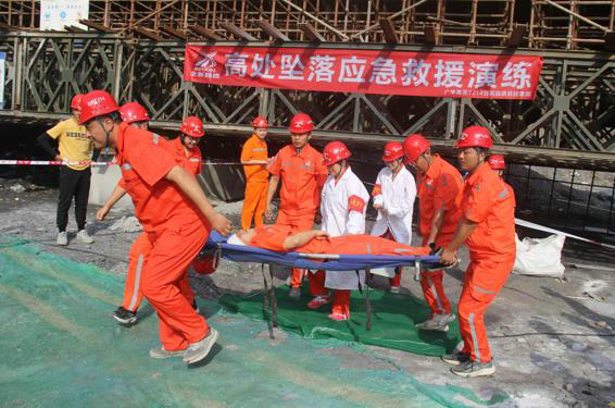 通過(guò)模擬高空作業(yè)人員在高架橋面系施工過(guò)程中墜落受傷的場(chǎng)景,展示了從發(fā)現(xiàn)傷員、通知事故情況、啟動(dòng)緊急預(yù)案、組織應(yīng)急救援小組展開(kāi)施救到后期處理的全部環(huán)節(jié)。過(guò)程中,搶險(xiǎn)救援組、醫(yī)療救護(hù)組、警戒保衛(wèi)組等小組對(duì)應(yīng)急救援處置程序、方法和注意事項(xiàng)等進(jìn)行了詳細(xì)演示和說(shuō)明,大家各盡其職、行動(dòng)有序,整個(gè)演練過(guò)程忙而不亂,完整有序,達(dá)到了預(yù)期目的。