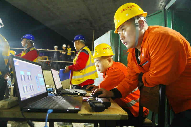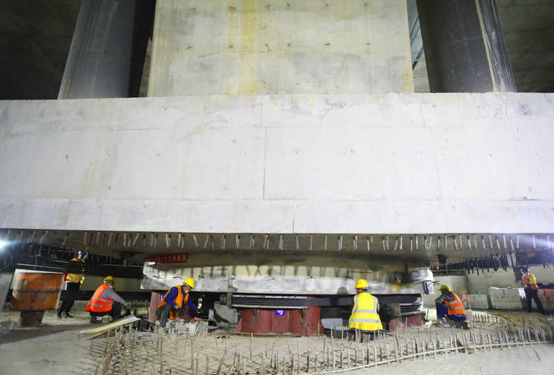 該轉體梁結構由下承臺、球鉸、上轉盤和轉動牽引系統(tǒng)組成。為確保橋梁完成高精度轉體,施工單位精心組織不斷完善施工方案,對主橋結構尺寸進行了三維建模和應力分析,對大噸位轉體支座進行了特殊優(yōu)化設計。轉體過程中,克服了夜間施工條件差、高空作業(yè)安全風險高等不利因素,做到施工組織、過程卡控、責任落實等關鍵環(huán)節(jié)的無縫連接。箱梁先后完成順時針84.69度和逆時針95.61度的轉體角度,轉體精度達到毫米級。轉體后,原本平行于鐵路線的預制梁體變?yōu)闄M跨21條線路的空中廊道,轉體梁施工工藝既減少了對鐵路運輸?shù)挠绊?,又降低了施工安全風險,實現(xiàn)了完美對接。