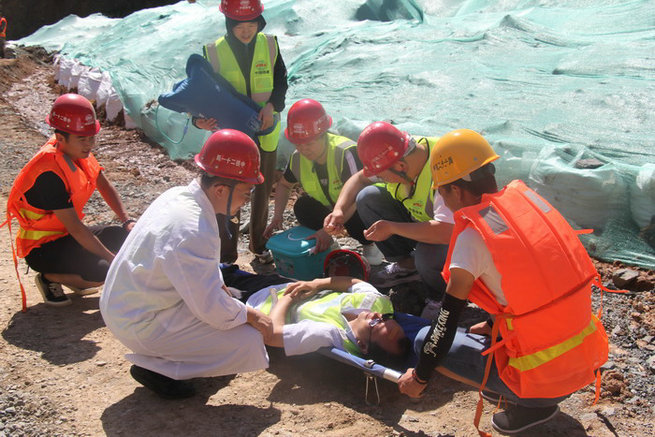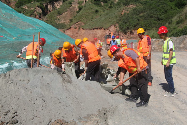 防洪防汛應(yīng)急演練現(xiàn)場(chǎng) 此次演練是模擬該標(biāo)段15#棄渣場(chǎng)因碎石場(chǎng)生產(chǎn)原因還未進(jìn)行整平碾壓成型,項(xiàng)目所在地受冷空氣影響發(fā)生強(qiáng)降雨,降雨量在12小時(shí)內(nèi)達(dá)到100mm,棄渣場(chǎng)溝體坡度較大,臨時(shí)排水系統(tǒng)排水不暢,坡腳棄渣因浸泡而發(fā)生邊坡垮塌,積水過(guò)量后形成泥石流,項(xiàng)目應(yīng)急救援領(lǐng)導(dǎo)小組迅速啟動(dòng)應(yīng)急預(yù)案,立即開展救援工作。演練分預(yù)警報(bào)告、集合分工、排除險(xiǎn)情和匯報(bào)總結(jié)四步進(jìn)行,全體員工及勞務(wù)人員分成搶險(xiǎn)救援、善后處理、警戒保衛(wèi)、通訊聯(lián)絡(luò)、醫(yī)療救援和物資保障等六個(gè)小組。參加演練人員按照預(yù)案,服從指揮、各司其職、密切配合,保證了防洪防汛應(yīng)急演練活動(dòng)順利完成。