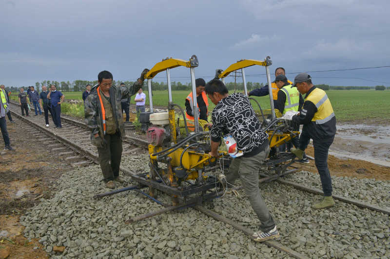 此時水害現(xiàn)場,大雨入注一陣緊似一陣,肆虐的洪水夾雜著折斷的樹枝和石塊從山上奔瀉而下,搶險人員不顧一切與暴風(fēng)雨展開搏擊,趟過深一腳、淺一腳的泥水,人抬肩扛一溜小跑搶運物料,40多分鐘便筑起了一道50余米長的堤壩,阻止洪水再次侵襲路基,為后續(xù)清淤和水毀路基修復(fù)施工打開通道。接著挖掘機(jī)、裝載機(jī)、自卸車進(jìn)入現(xiàn)場,在機(jī)械轟鳴中開始清除滯留的淤泥、石塊等廢物,清理現(xiàn)場平整路基,填筑應(yīng)急儲備砟石115立方米。搶險隊員緊隨其后,整理路基道床、搗固線路、檢查線路幾何尺寸,爭分奪秒修復(fù)線路,檢查線路周邊地區(qū)水害和下游排水疏通情況......
