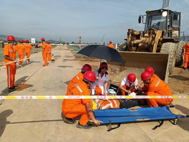 本次演練為機(jī)械傷害事故應(yīng)急救援。情景模擬了裝載機(jī)駕駛員在施工作業(yè)過程中,因視線盲區(qū)誤碰工人,造成人員受機(jī)械傷害。在發(fā)生險情后,該項目第一時間啟動應(yīng)急預(yù)案,對施工現(xiàn)場進(jìn)行了緊急情況處置,應(yīng)急救援組、醫(yī)療救護(hù)組、后勤保障組等火速趕到事故現(xiàn)場展開救援行動并根據(jù)傷者情況撥打急救電話,經(jīng)過緊張有序的救援,受傷人員被送往醫(yī)院得到及時救治。過程中,各參演隊員反應(yīng)迅速、措施規(guī)范,整場演練流程緊湊、場景逼真,充分體現(xiàn)了“以人為本、科學(xué)施救”的演練理念。