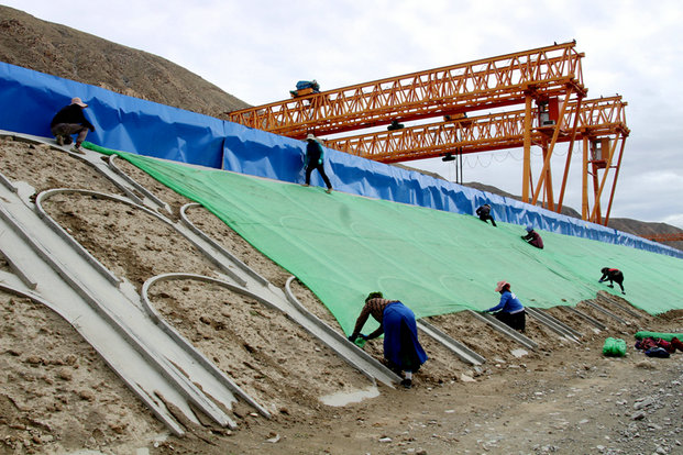 由于項(xiàng)目地處海拔4000米的高原河谷地帶,植被稀疏,風(fēng)沙大,生態(tài)環(huán)境極度薄弱。為保護(hù)環(huán)境減少揚(yáng)塵,項(xiàng)目部在完成邊坡骨架防護(hù)工作后,聘用當(dāng)?shù)夭刈迦罕娭膊菰曰?。為適應(yīng)當(dāng)?shù)丨h(huán)境氣候,特意選用格?;ㄅc黑麥草進(jìn)行混合播種,項(xiàng)目部在播撒草籽后用防塵蓋土網(wǎng)覆蓋,并安排水車每天灑水一次,確保草種順利發(fā)芽。
