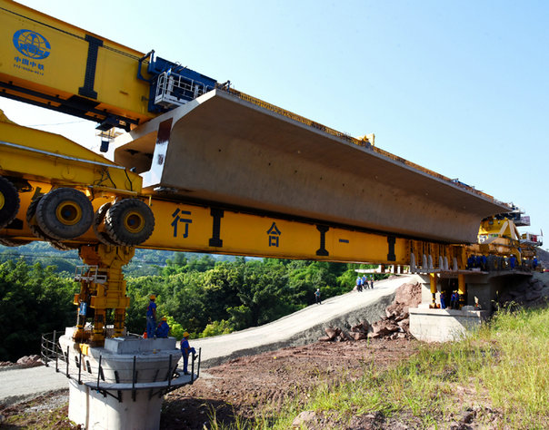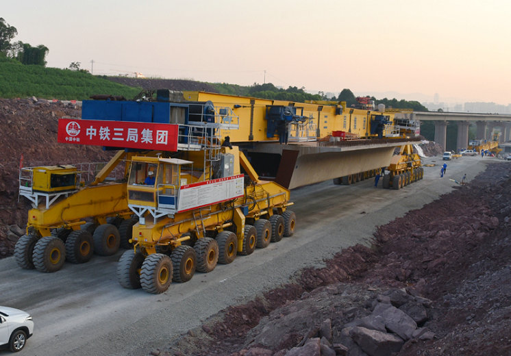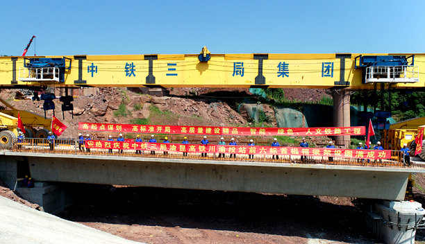 7月10日上午,位于宜賓市的中鐵三局渝昆高鐵站前六標(biāo)架梁施工現(xiàn)場(chǎng),在39度的高溫天氣下,隨著指揮人員一聲令下,首榀長(zhǎng)達(dá)32米、重達(dá)800噸的雙線箱梁穩(wěn)穩(wěn)地架設(shè)在李家村3號(hào)大橋3#-4#橋墩上,拉開了渝昆六標(biāo)箱梁架設(shè)序幕,正式開啟“架梁模式”。
