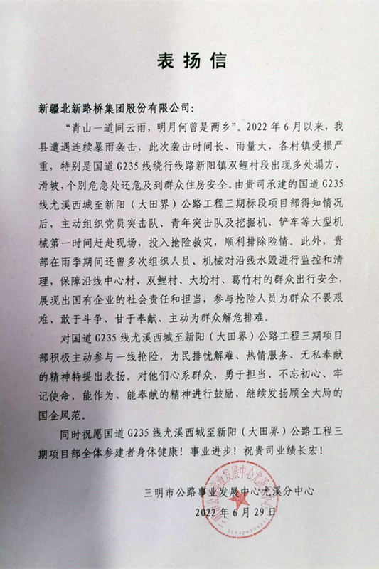 尤溪訊(通訊員 劉小波)近日,北新路橋集團(tuán)長沙分公司國道G235線尤溪西城至新陽(大田界)公路工程三期項目部收到來自福建省三明市公路事業(yè)發(fā)展中心尤溪分中心的表揚信,表揚該項目部在6月份暴雨襲擊尤溪縣時,用行動彰顯責(zé)任、用擔(dān)當(dāng)詮釋使命,敢作為、能奉獻(xiàn)、顧大局的精神。