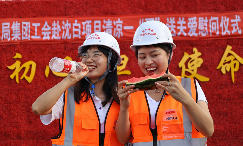 北國盛夏、酷暑難耐。7月18日,中鐵二十三局集團有限公司工會“清涼一‘夏’送關(guān)愛”慰問活動,走進正在緊張施工沈白高鐵項目部,向戰(zhàn)高溫、斗酷暑,堅守施工生產(chǎn)一線的建設(shè)者致敬,送來了工會組織的關(guān)心和問候。