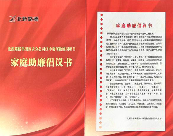 家風(fēng)清則作風(fēng)正,家風(fēng)廉則黨風(fēng)端。為聚焦發(fā)揮反腐倡廉“大后方”的作用,突出家庭在推動黨風(fēng)廉政建設(shè)中的重要地位。近日,北新路橋集團(tuán)西安分公司漢中褒河物流園項目結(jié)合第二十四黨風(fēng)廉政月活動積極開展家庭助廉行動,以清正廉潔家風(fēng)筑牢拒腐防變堅固堡壘。