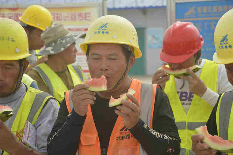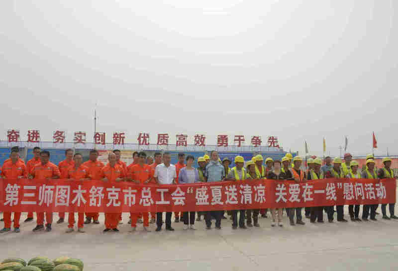 7月27日上午,第三師圖木舒克市總工會赴北新路橋集團(tuán)圖昆公路(三師段)一標(biāo)項(xiàng)目部建設(shè)一線,開展“盛夏送清涼、關(guān)愛在一線”慰問活動(dòng),三師總工會黨組書記、主席張娟,三師總醫(yī)院醫(yī)護(hù)人員、代建指揮部和項(xiàng)目人員等出席活動(dòng)。
