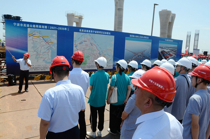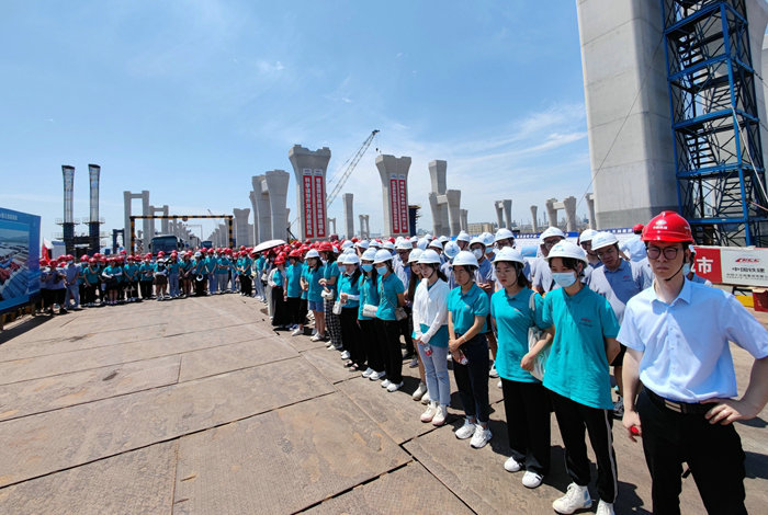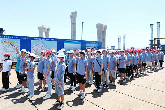 隨后大學(xué)生們排著整齊的隊伍,前往互通區(qū)G匝道觀摩架設(shè)好的雄偉、壯觀的月亮型鋼箱梁,并環(huán)顧四周,海水中林立的內(nèi)實外美的橋墩深深地吸引了他們的目光,紛紛舉起手機拍照,將宏大的場景記錄下來,分享給遠方的同學(xué)和家人們。