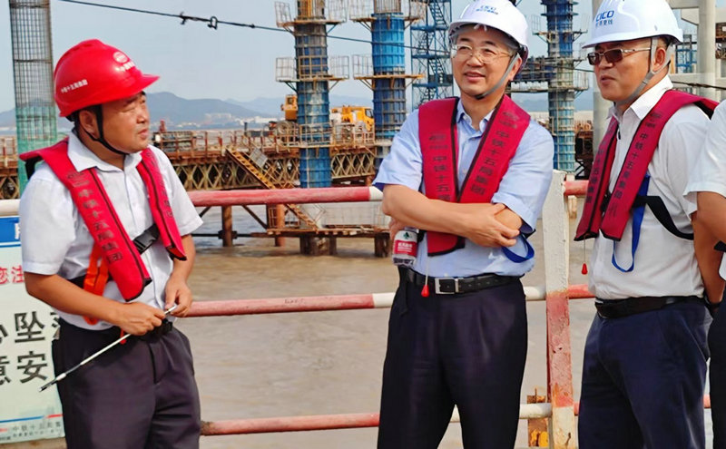 陳江查看了主線橋墩、H匝道墩身安裝鋼筋籠、立模施工情況及完工的橋墩。他對(duì)項(xiàng)目的總體質(zhì)量、安全、進(jìn)度、環(huán)保等情況表示滿意,深有感觸地說:“濱?;ネㄊ莵喼拮畲蟮暮I狭⒔?,施工難度大,質(zhì)量要求高,從總體上看,十五局干得不錯(cuò),對(duì)你們付出的辛勤勞動(dòng)提出表揚(yáng)!”根據(jù)綜合調(diào)研情況,他提出三點(diǎn)要求:一是做好防暑降溫工作。今年浙江全省氣候反常,出現(xiàn)50年一遇的干旱天氣,6月下旬以來,36度—40度高溫天氣持續(xù),對(duì)現(xiàn)場(chǎng)施工人員的健康很不利,要采取有效措施防止員工中暑。二是繼續(xù)抓好施工進(jìn)度和質(zhì)量。工程進(jìn)入后期,越要重視進(jìn)度和質(zhì)量,不能放松,早完工一天,質(zhì)量沒問題,是交投集團(tuán)和十五局的共同目標(biāo)。三是抓好施工安全。安全是項(xiàng)目施工的重中之重,海上作業(yè),安全風(fēng)險(xiǎn)高,責(zé)任必須一竿子插到底,制度落實(shí)一定要到位,不能有絲毫馬虎,確保項(xiàng)目平平安安。